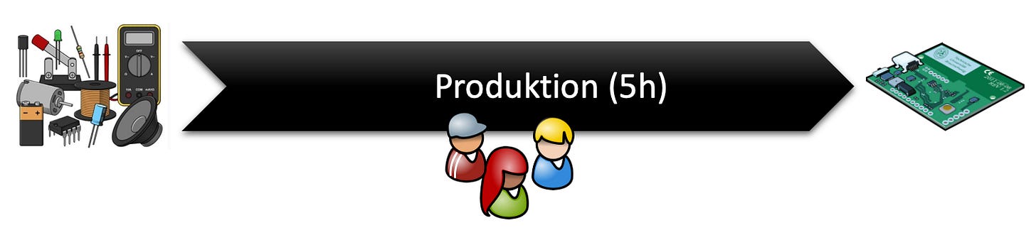 Sven hat von Anfang an erkannt, dass er seine Geräte nicht allein herstellen will. Erstens hätte er dann keine Zeit für seine geschäftsführenden Aufgaben. Zweitens hat er keine Lust auf solche Fließbandarbeit; er ist ein kreativer Kopf! Drittens würde das die Produktion auf sequenzielle Herstellung eines Gerätes nach dem anderen begrenzen. Das ist aber nicht nötig, weil sich das Gerät wunderbar arbeitsteilig fertigen lässt. Dafür hat Sven ja seine 3 Angestellten.