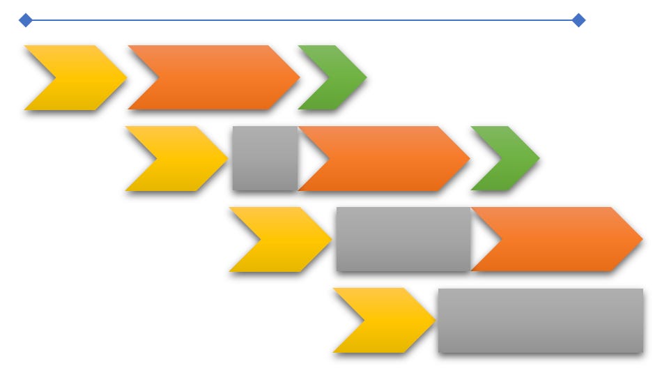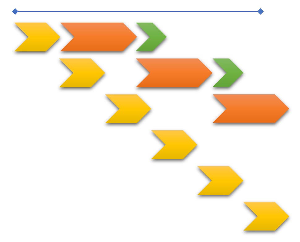 Solange es in der Produktion keine Wartezeit gibt, ist die Flow Efficiency 1 oder 100%, weil Touch Time gleich Flow Time ist. Wächst jedoch die Flow Time durch Wartezeit zwischen den Schritten wie oben schon ab dem zweiten Gerät… dann fällt die Flow Efficiency unter 100%. Im obigen Beispiel ist sie schon für das zweite Gerät nur noch 5/6 = 83%, beim dritten Gerät dann 5/7=71% usw.