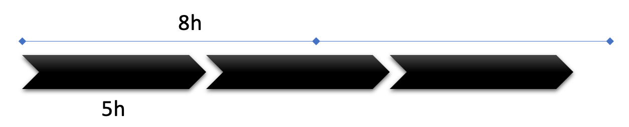Je Gerät ist die reine Touch Time (TT) 5 Stunden — allerdings nicht am Stück. Am Stück arbeiten die drei nur beim ersten Gerät. Schon beim zweiten schleicht sich Wartezeit ein. Beim dritten ist die noch größer. Und beim vierten noch größer…