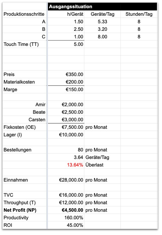 Sven ist nach dieser Analyse klar, dass Verbesserungen an der Produktionskapazität ansetzen müssen. Dafür ist ein detaillierter Blick auf seine jetzige Situation nötig. Es geht nicht mehr nur um Finanzkennzahlen: