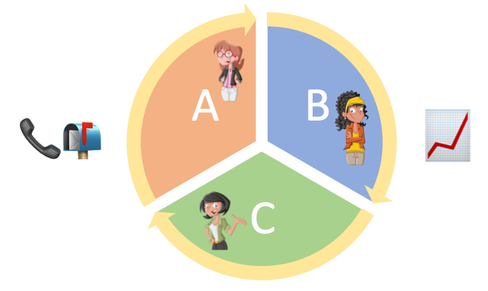 Annette, Beatrice und Carolin arbeiten jede in ihren Phasen so lange an einem Auftrag, bis er für sie in ihrer Rolle im Produktionsprozess abgeschlossen ist. Das bedeutet, Annette fängt einen Auftrag nicht an, wenn der eintrifft, sondern beendet in ihrer Phase A erst den, den sie schon angefangen hatte.